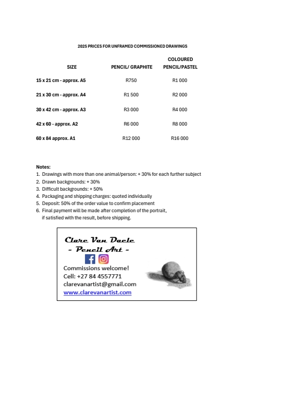 The following charges apply for commissions and are for unframed drawings: